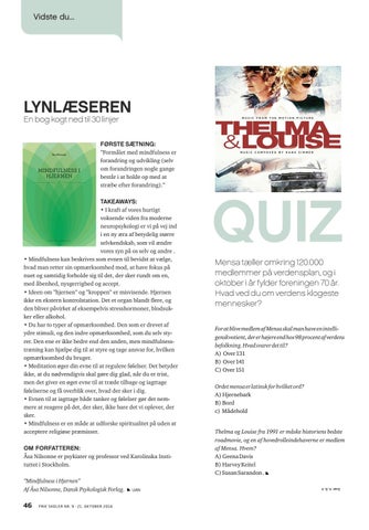 QUIZ Mensa tæller omkring 120.000 medlemmer på verdensplan, og i oktober i år fylder foreningen 70 år. Hvad ved du om verdens klogeste mennesker? For at blive medlem af Mensa skal man have en intelligenskvotient, der er højere end hos 98 procent af verdens befolkning. Hvad svarer det til? A) Over 131 B) Over 141 C) Over 151 Ordet mensa er latinsk for hvilket ord? A) Hjernebark B) Bord c) Mådehold Thelma og Louise fra 1991 er måske historiens bedste roadmovie, og en af hovedrolleindehaverne er medlem af Mensa. Hvem? A) Geena Davis B) Harvey Keitel C) Susan Sarandon . Svar: A, B, A