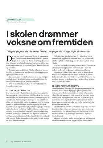 SKOLEN ER EN KAMPPLADS Den seneste runde i slagsmålet om fremtiden møder danske lærere og elever i det nye skoleår med folkeskolereformen, og lærere i både frie skoler og i folkeskolen har fået nye regler for arbejdstiden. Reformen og de nye regler er som altid blevet til i et mix af det politisk mulige, traditioner, øvrig lovgivning, hensyn til opinionsmålinger, økonomi og en hel del mere. Resultatet er, at ingen virker rigtig tilfredse, og nogle særdeles utilfredse. Derfor besluttede vi på Frie Skolers redaktion, at vi for en gangs skyld ville frigøre os fra det muliges kunst og markere starten på et nyt skoleår ved at give en række folk med spændende ideer muligheden for at beskrive, hvordan de ville indrette skolen, hvis de kunne frigøre sig fra alle hensyn til, hvad der er realiserbart.