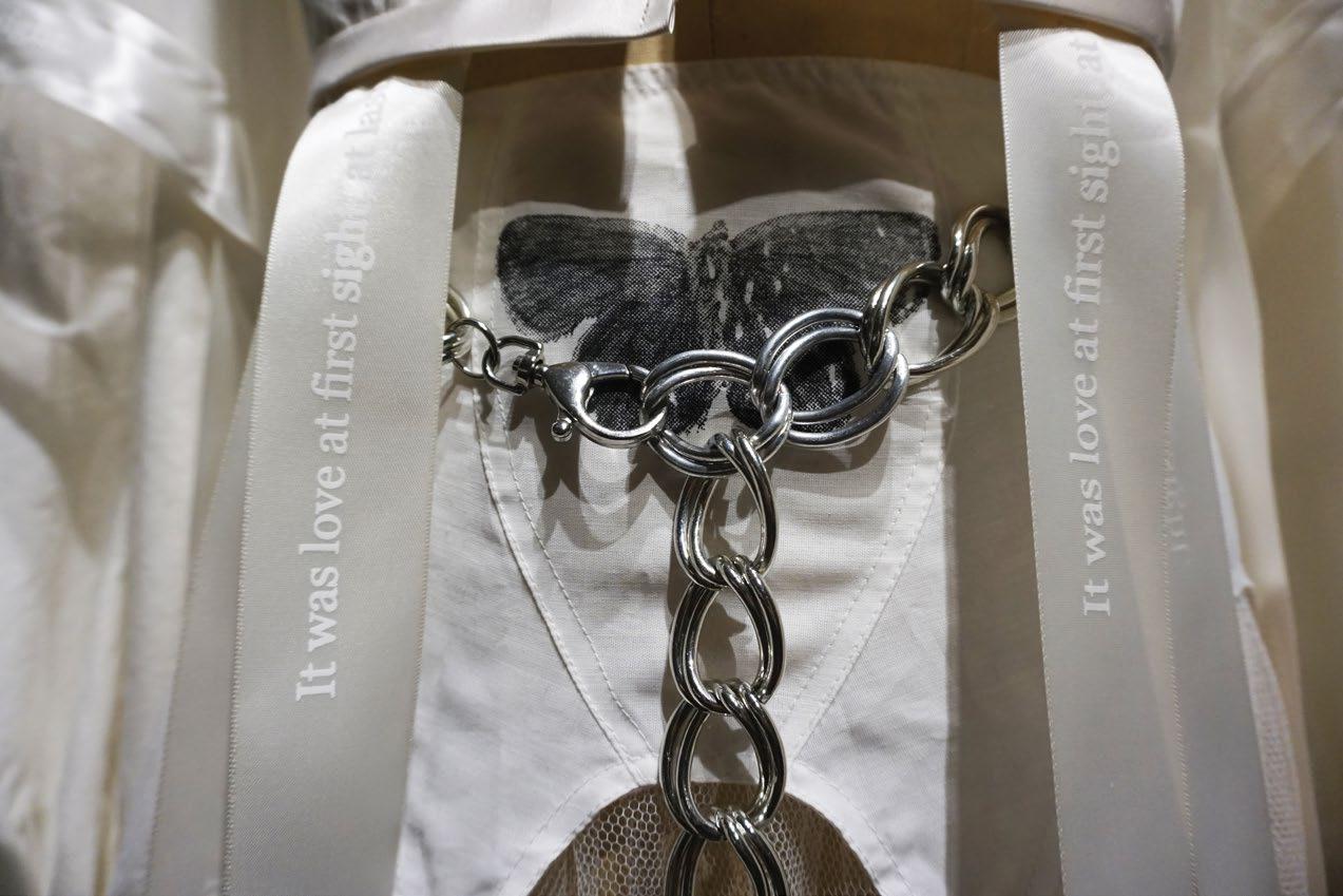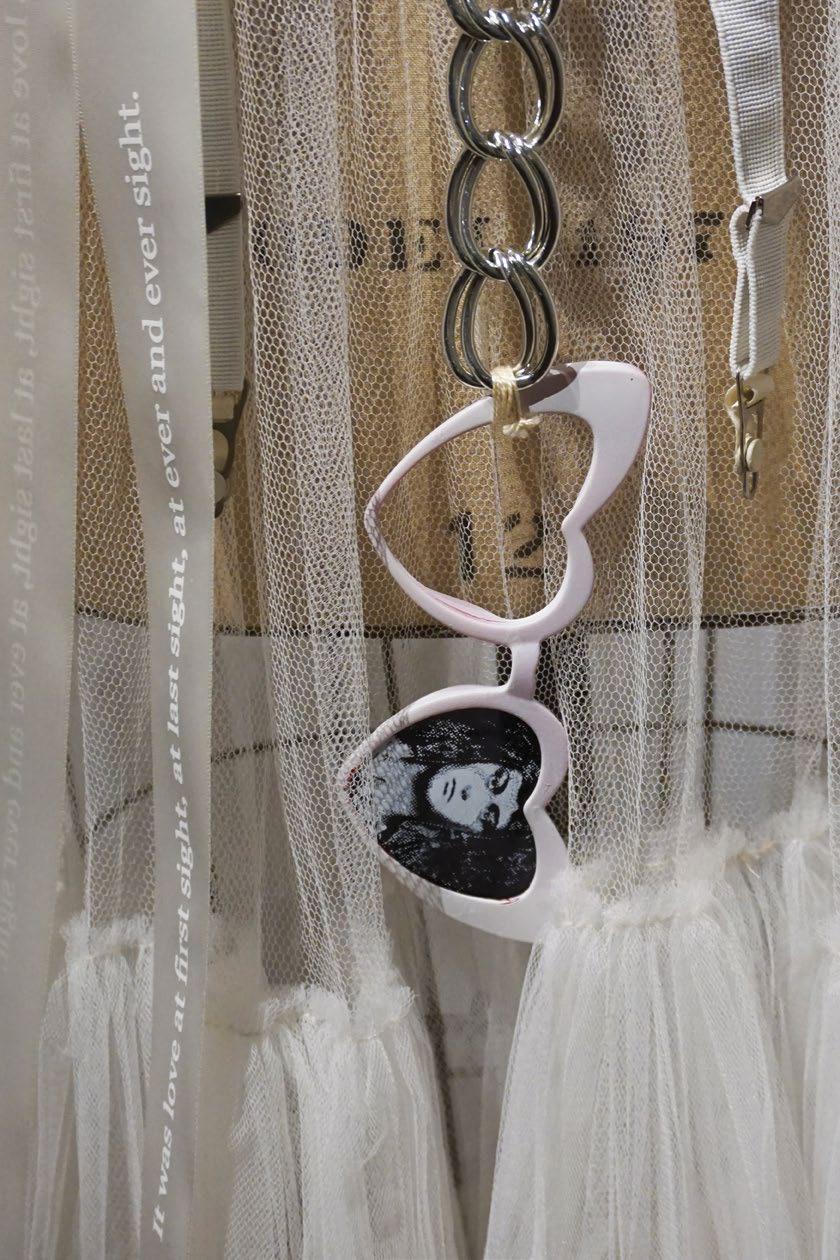 Hunted Enchanter is a rumination on the novel Lolita, its cultural impact, and how it relates to my own experiences. By using bedsheets, tulle and satin trim from a wedding dress, stockings, a garter belt, sunglasses, spikes and chains, along with techniques of embroidery and printing, I challenge the cultural narrative of Lolita as a love story. Ultimately, I assert the gaze of a former so-called “nymphet” as an adult survivor.