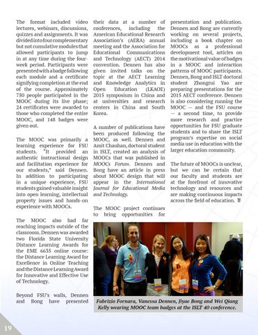 The format included video lectures, webinars, discussions, quizzes and assignments. It was divided into four complementary but not cumulative modules that allowed participants to jump in at any time during the fourweek period. Participants were presented with a badge following each module and a certificate signifying completion at the end of the course. Approximately 750 people participated in the MOOC during its live phase; 24 certificates were awarded to those who completed the entire MOOC, and 148 badges were given out. The MOOC was primarily a learning experience for FSU students. “It provided an authentic instructional design and facilitation experience for our students,” said Dennen. In addition to participating in a unique experience, FSU students gained valuable insight into open learning, intellectual property issues and hands-on experience with MOOCs. The MOOC also had far reaching impacts outside of the classroom. Dennen was awarded two Florida State University Distance Learning Awards for the EME 6635 online course: the Distance Learning Award for Excellence in Online Teaching and the Distance Learning Award for Innovative and Effective Use of Technology. Beyond FSU’s walls, Dennen and Bong have presented