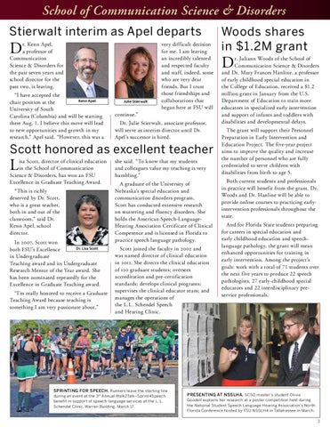 she said. “To know that my students and colleagues value my teaching is very humbling.” A graduate of the University of Nebraska’s special education and communication disorders program, Scott has conducted extensive research on stuttering and f luency disorders. She holds the American Speech-LanguageHearing Association Certificate of Clinical Competence and is licensed in Florida to practice speech language pathology. Scott joined the faculty in 2002 and was named director of clinical education in 2012. She directs the clinical education of 120 graduate students; oversees accreditation and pre-certification standards; develops clinical programs; supervises the clinical educator team; and manages the operations of the L.L. Schendel Speech and Hearing Clinic.