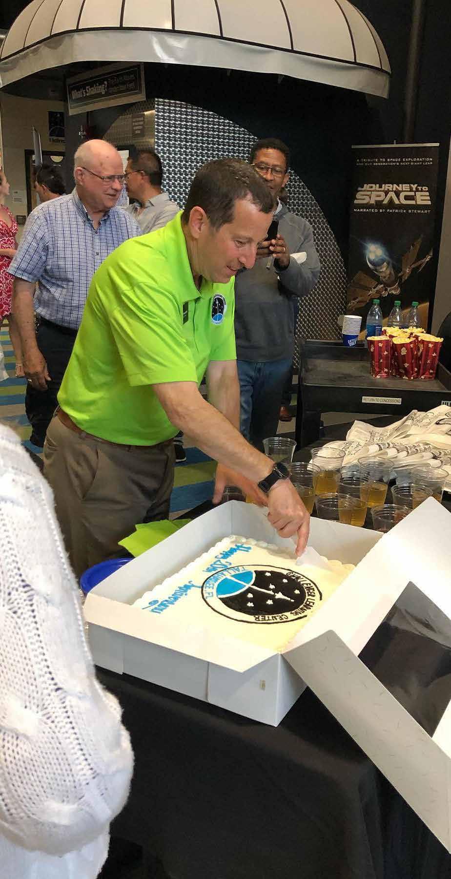 Alumnus and Director of the Challenger Learning Center Alan Hanstein cut the cake at the Challenger's 20th Anniversary Celebration.