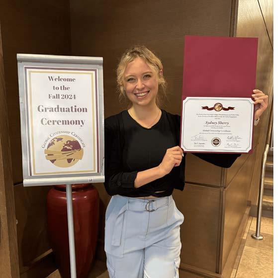 Sydney Sherry, a Media Communication Studies student, completed the Global Citizenship Certificate Program (GCC). The programoffersatransformativeexperiencebydeepeningstudents’ understanding of global issues and intercultural communication. Withadualinterestincommunicationstudiesandsocialwork,the programallowedSherrytoengagewithcomplexglobalissueswhile practicing cultural humility and understanding. Sherry is also the 2025PresidentofLambdaPiEta(LPE),thenationalcommunication honorsocietyatFloridaStateUniversity.UnderSherry’sleadership, LambdaPiEtahasimproveditsprofessionaldevelopmentofferings —hosting career events with the FSU Career Center and creating academic-focusedworkshops.