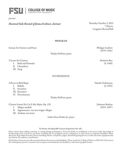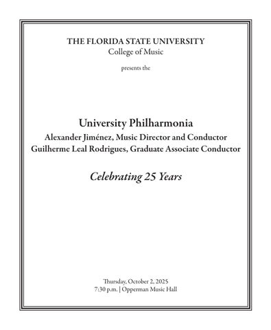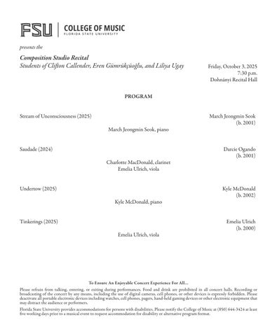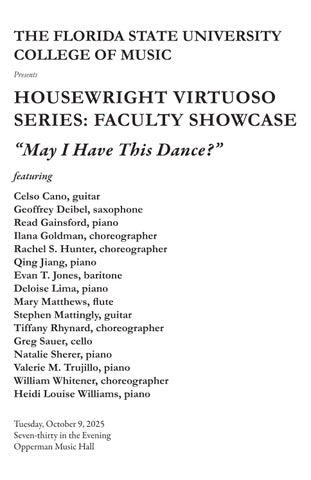 Florida State University provides accommodations for persons with disabilities. Please notify the College of Music at (850) 644-3424 at least five working days prior to a musical event to request accommodation for disability or alternative program format.