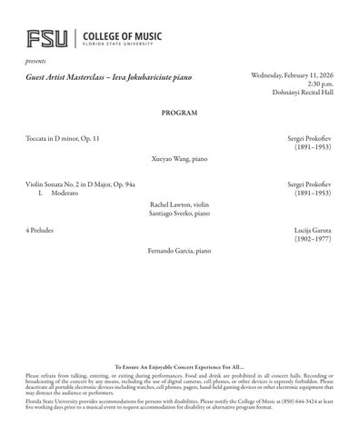 Florida State University provides accommodations for persons with disabilities. Please notify the College of Music at (850) 644-3424 at least five working days prior to a musical event to request accommodation for disability or alternative program format.