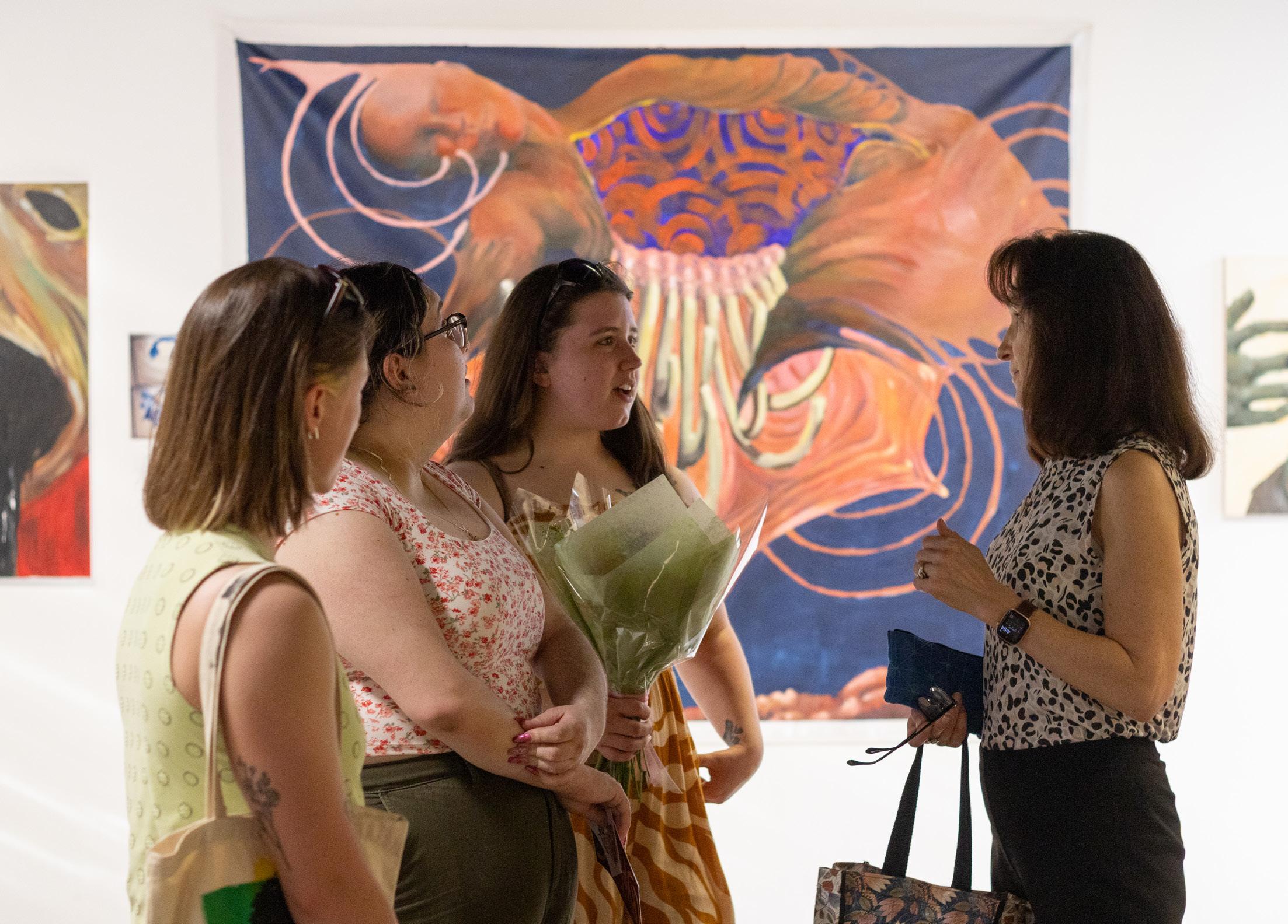 (Left) Alyssa Domrose, Miranda Allicon, Kendall Winston, and Professor of Art Jennifer Dowling chatting at the MazGal show on April 14.