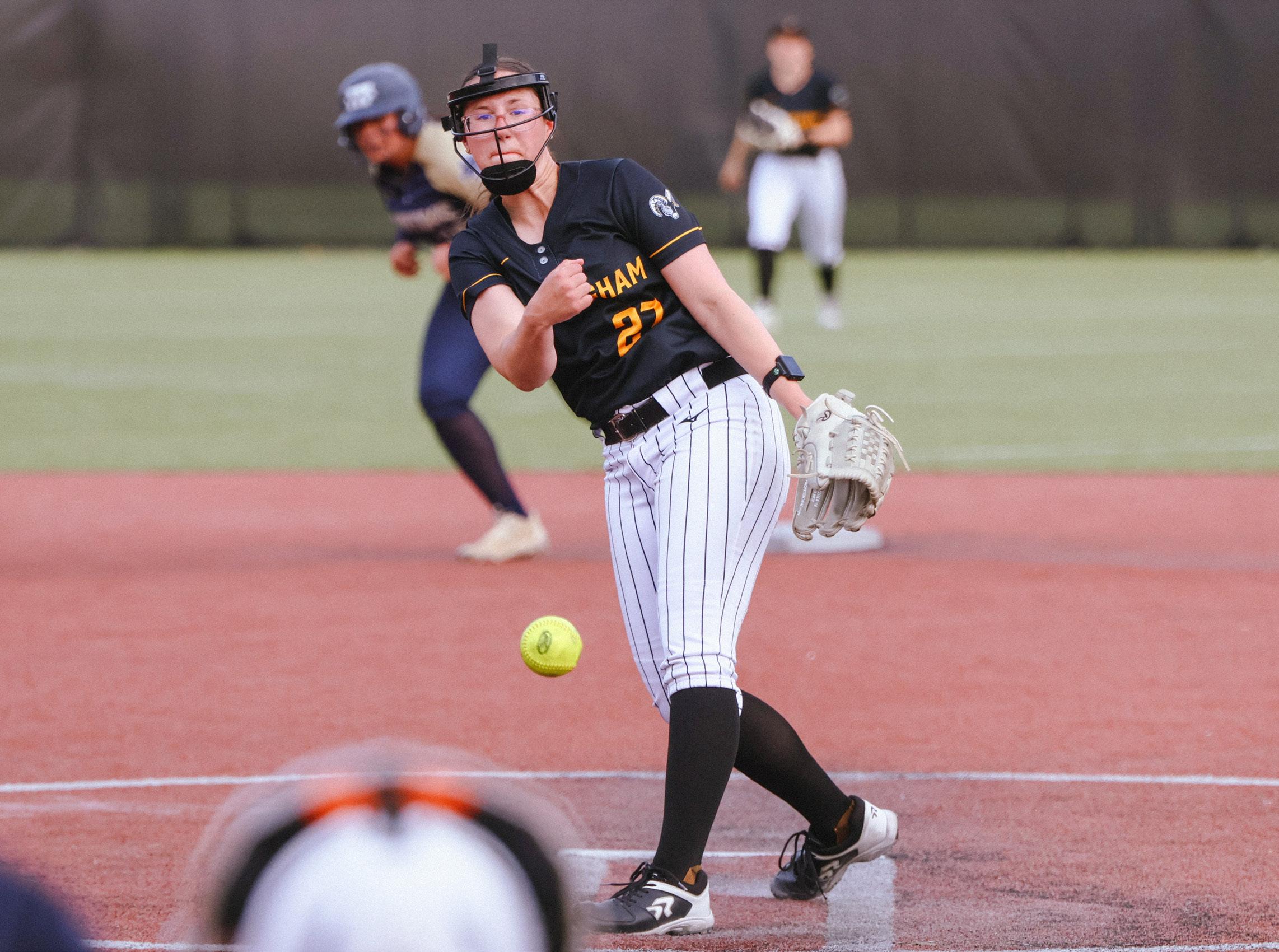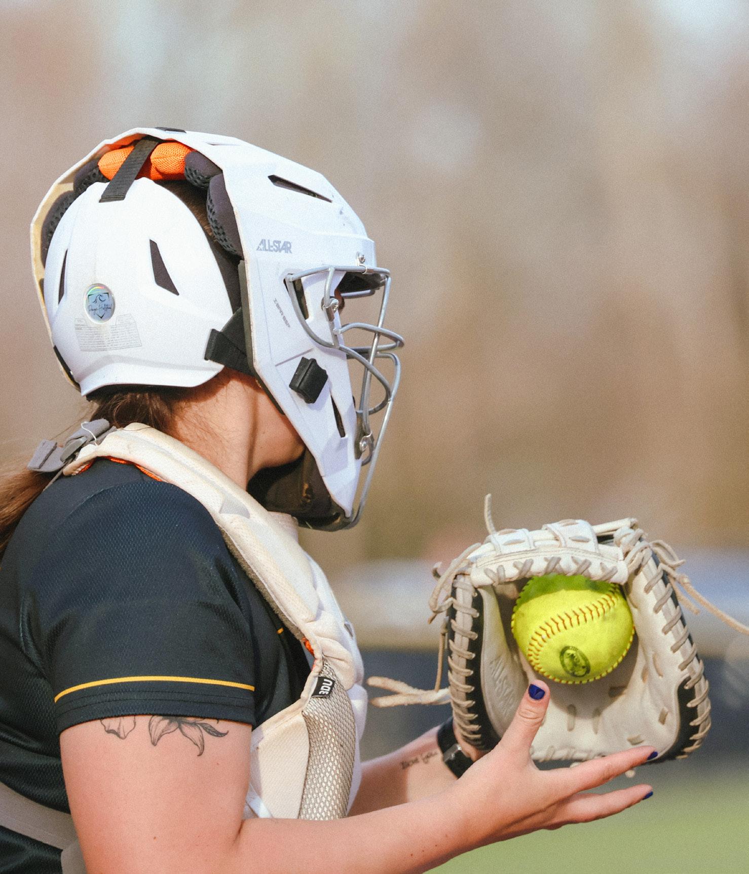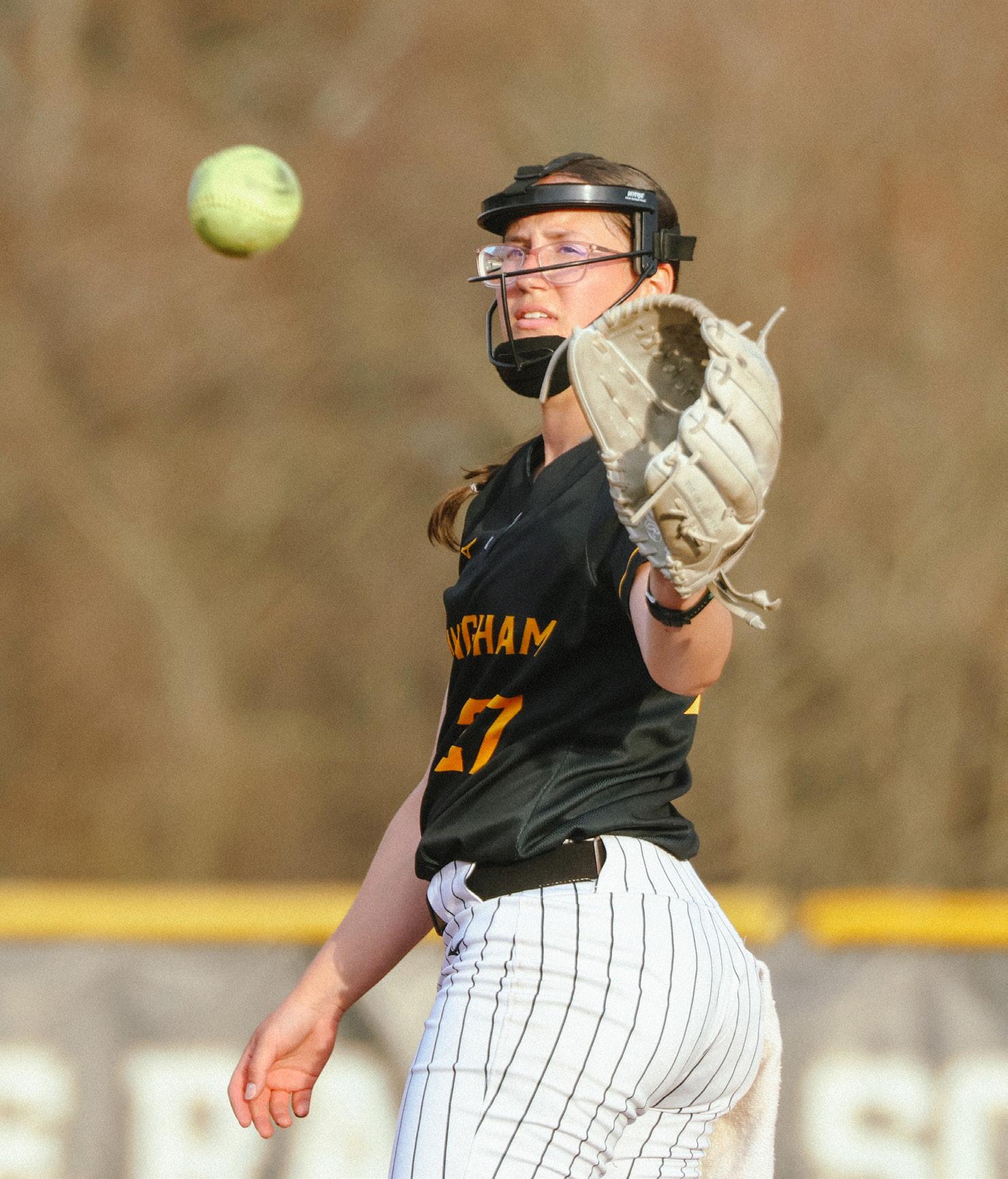 (Left) Catcher Jocelyn Pepe preparing to throw the ball back to pitcher Audrey Gauthier in win against Mass. Maritime on April 14.
