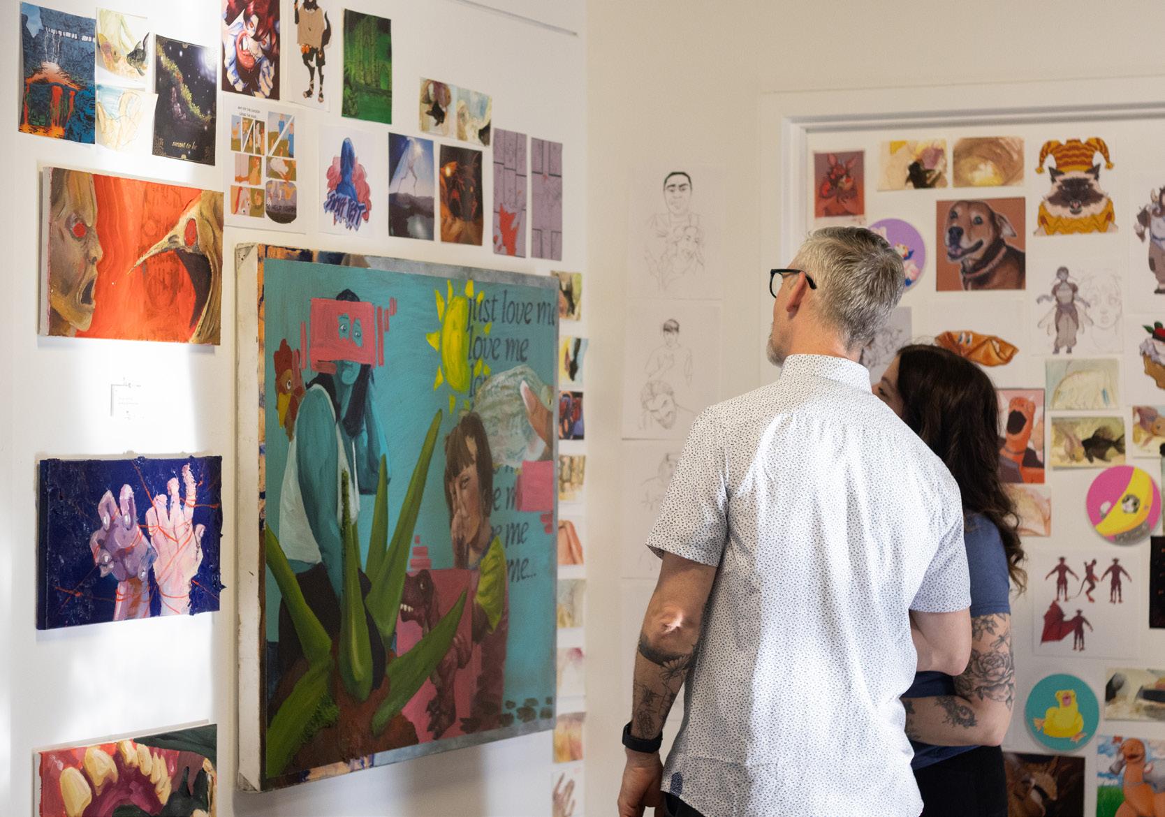 Attendees looking At Artwork by Autumn rAy At the mAzmAniAn gAllery senior CApstone showCAse on April 14.