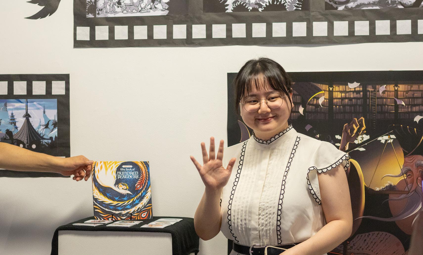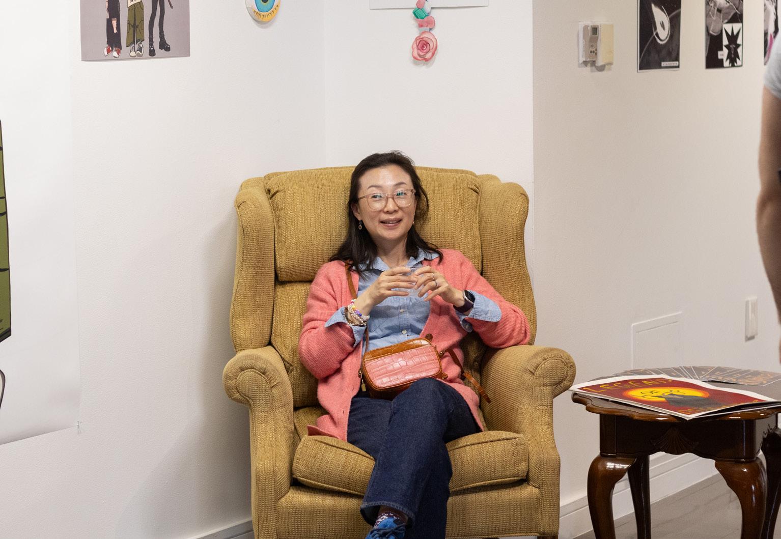 yumi pArker sitting with ChArlotte pArker’s Art At the mAzmAniAn gAllery senior CApstone showCAse on April 14.