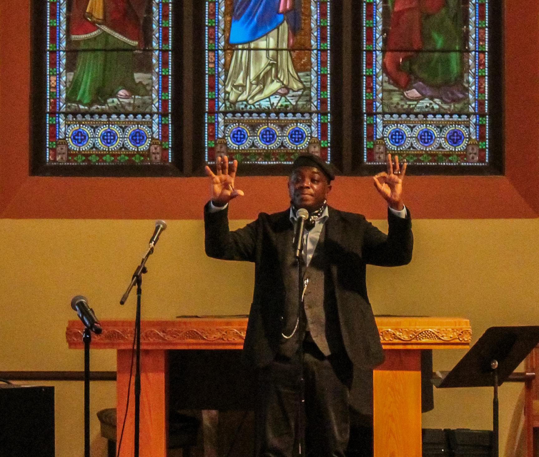 Regie Gibson performs at the Miriam Levine Reading on April 1.
