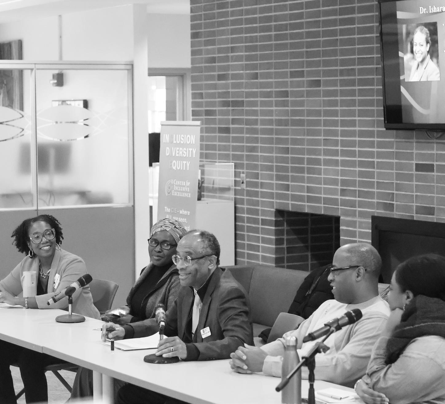 Antonio Machado / THE GATEPOST (Left) Panelists Stephanie Logan, Vivian Okyere, Benjamin Day, David Baldwin, and Tatiana Johnson-Boria answering questions at the CIE.