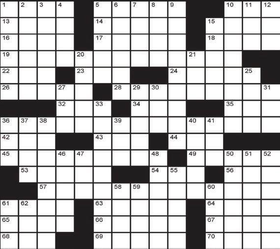 ARTS & FEATURES ACROSS 1. General activities? 5. “ e Way” singer Jill 10. Spanx product 13. Give o , as light 14. Plains dwelling 15. Un lled space 16. Package sealer 17. Echo Dot assistant 18. Word a er a mistake 19. *HOMES for remembering the Great Lakes, e.g. 22. Eye exam providers: Abbr. 23. Smooching on the bus, for short 24. Hole digger’s tool 26. “Lady Marmalade” singer LaBelle 28. *Seed that chocolate comes from 32. Artist Yoko 34. Small doggo 35. Constellation found in “solar activity” 36. *“Pay attention to this!” 42. Praiseful poem 43. Spanish seasoning 44. “Illmatic” rapper 45. *Like some videos of growing plants 49. One way to spell meat on a stick 53. Player in a Georgia ddle contest, in a song 54. G.I. ration 56. Part of a history book 57. Investor with a limited role ... or the unpronounced letters in the rst words of the starred clues’ answers, collectively? 61. Glove worn at home 63. Like Dock Ellis’ perfect game 64. Model Hadid 65. Zone 66. Illinois airport 67. What to tap to open an app 68. Roof topping 69. Blew away 70. ___ shui DOWN 1. Spill cleaner 2. Seyfried of “A Mouthful of Air” 3. Most ready to be picked 4. Champagne ute part 5. Get up 6. Relating to the abdomen 7. Intl. oil cartel 8. It might contain an emoji 9. Quickly unboxes 10. New writer’s hope 11. “Let ’er ___!” 12. O en-skipped parts of videos 15. Words to study, for short 20. O er one’s two cents 21. Fresh hop or hazy beer 25. ___ Grey tea 27. Small kiddo 29. Milky-white gems 30. Ill-tempered dog 31. Formal objection 33. Available in stores 36. Parcel of land 37. “Look what ___!” 38. School term 39. Part of a jockey’s uniform 40. Impostor 41. Home to Nebraska and Alaska, brie y 46. Musical about Peron 47. Word before “Yachty” and “Peep,” in rap 48. Vast realm 50. “No ghting!” 51. Crater Lake’s state 52. Revealing to all 55. Gave stars on IMDb, say 58. NYC or LA neighborhood 59. Defrost 60. “I don’t have to work tomorrow!” 61. Wrestling surface 62. Investment initials Puzzle solutions are now exclusively online. Puzzles FRAMINGHAM STATE UNIVERSITY'S INDEPENDENT STUDENT NEWSPAPER SINCE 1932 | FSUGATEPOST.COM NOVEMBER 11, 2022 | 15