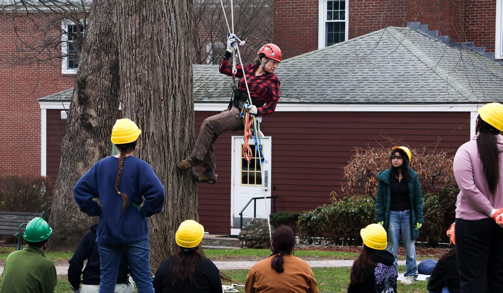 (Center) Biology Professor Brandi Van Roo demonstrating how to climb up the trees outside of Dwight Hall for students March 26.