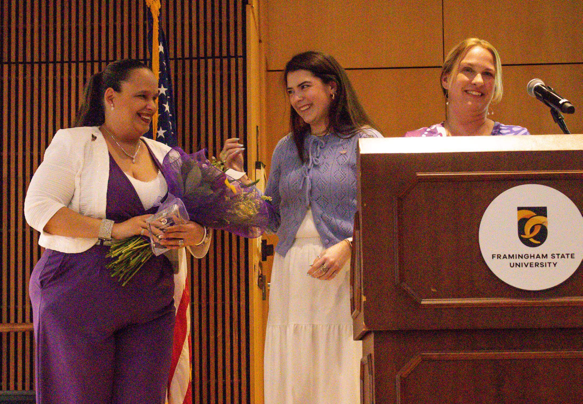 (Left) Jessica Davis, the 2026 Phenomenal Woman, accepting the award alongside (center) Meghan Larkin, 2025 Phenomenal Woman and associate director of Student Experience, and (right) Associate Dean of Students Rachel Spezia.