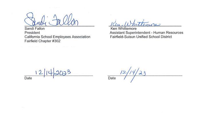 This agreement is entered into this 30th day of June 2023 between the Fairfield-Suisun Unified School District, hereinafter “the District,” and the California School Employees Association and its Chapter #302, hereinafter “the Union.”