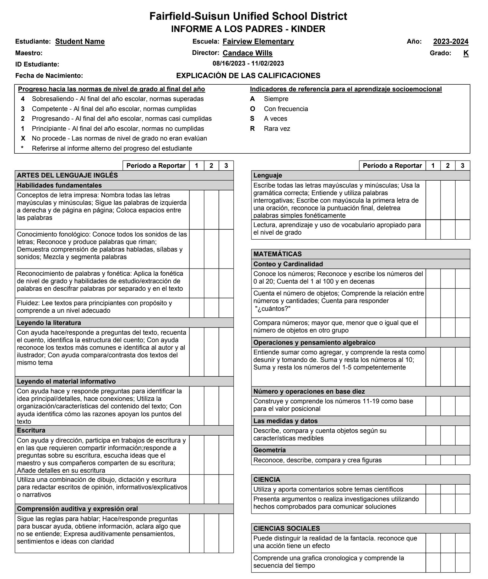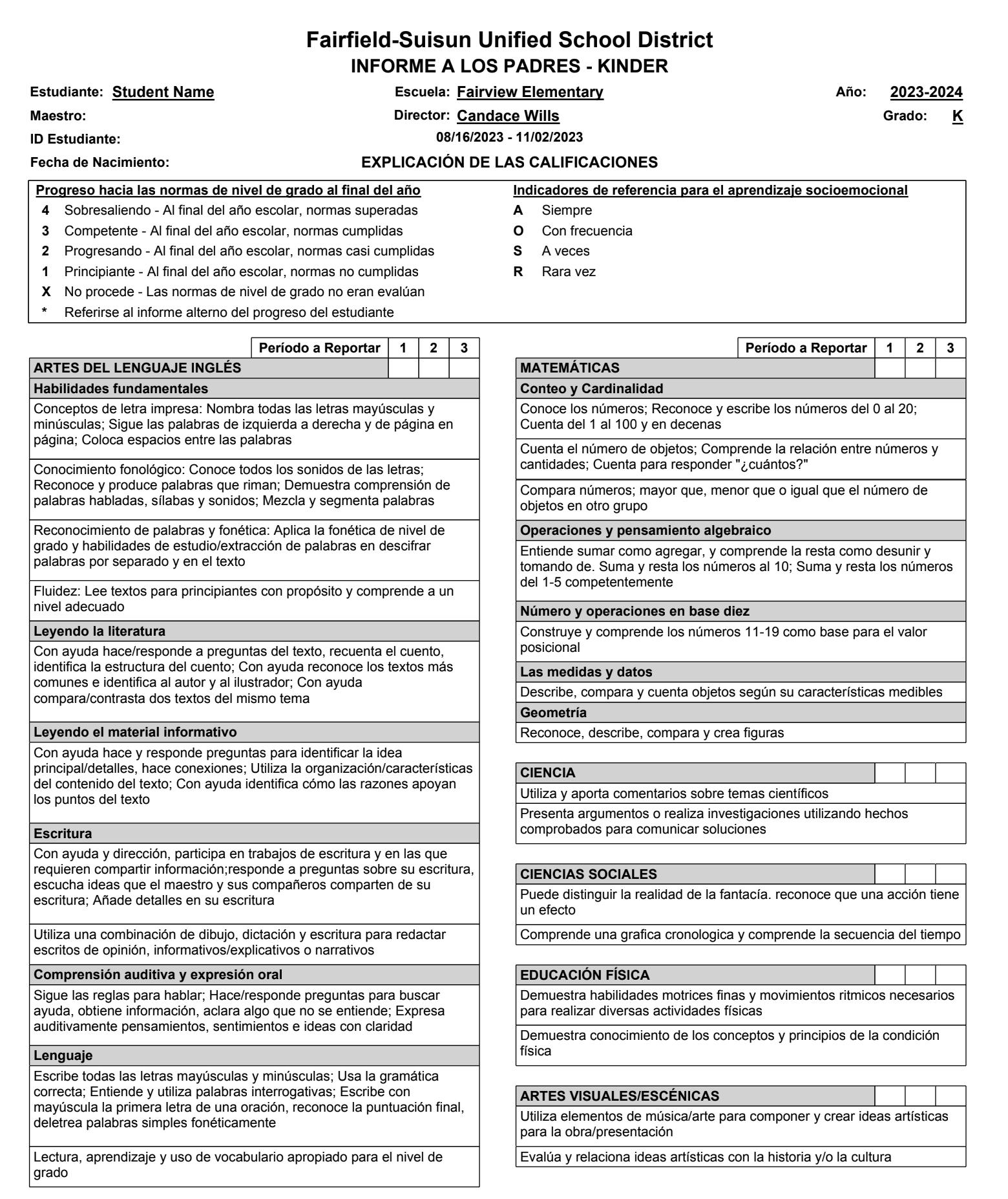El Distrito Escolar Unificado de Fairfield-Suisun (FSUSD, por sus siglas en inglés) ha establecido boletas de calificaciones en base a las normas para los grados de kínder a 3º. Esta conversión tiene como fin reflejar mejor el progreso de los estudiantes hacia el cumplimiento de las normas de nivel de grado de fin de año, en lugar de ofrecer una calificación general de rendimiento. La boleta de calificaciones actual prioriza el esfuerzo y las habilidades interpersonales más que los criterios académicos específicos que se abordan en el nuevo formato. Este cambio es importante, ya que apoya nuestra meta de brindar a todos los estudiantes una oportunidad equitativa de aprender y tener éxito, sin importar quiénes son o a qué escuela pertenecen.
