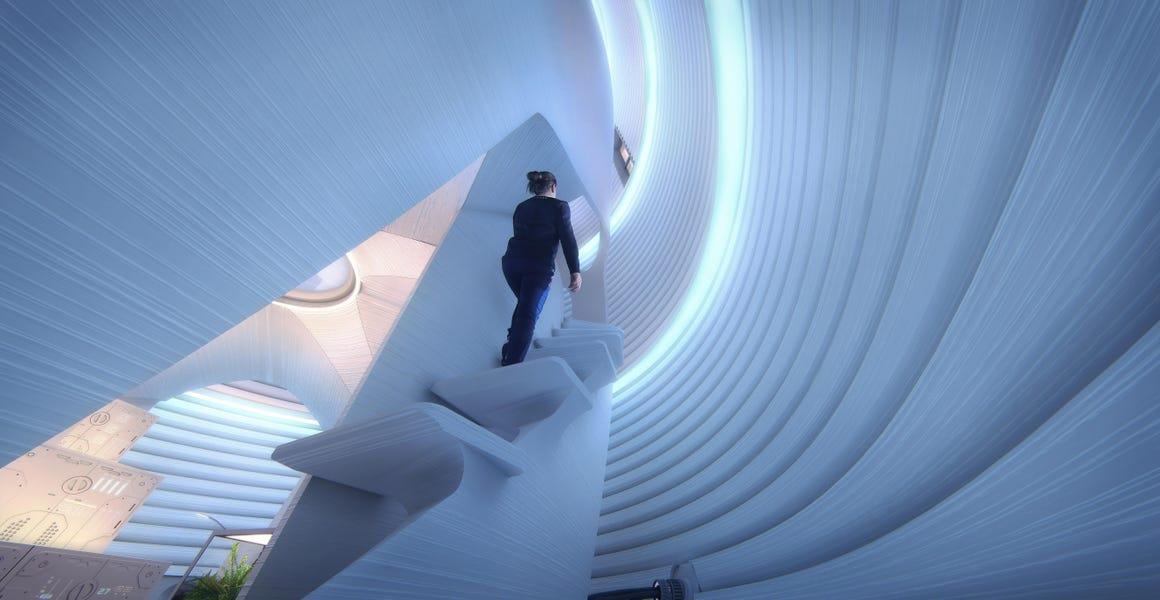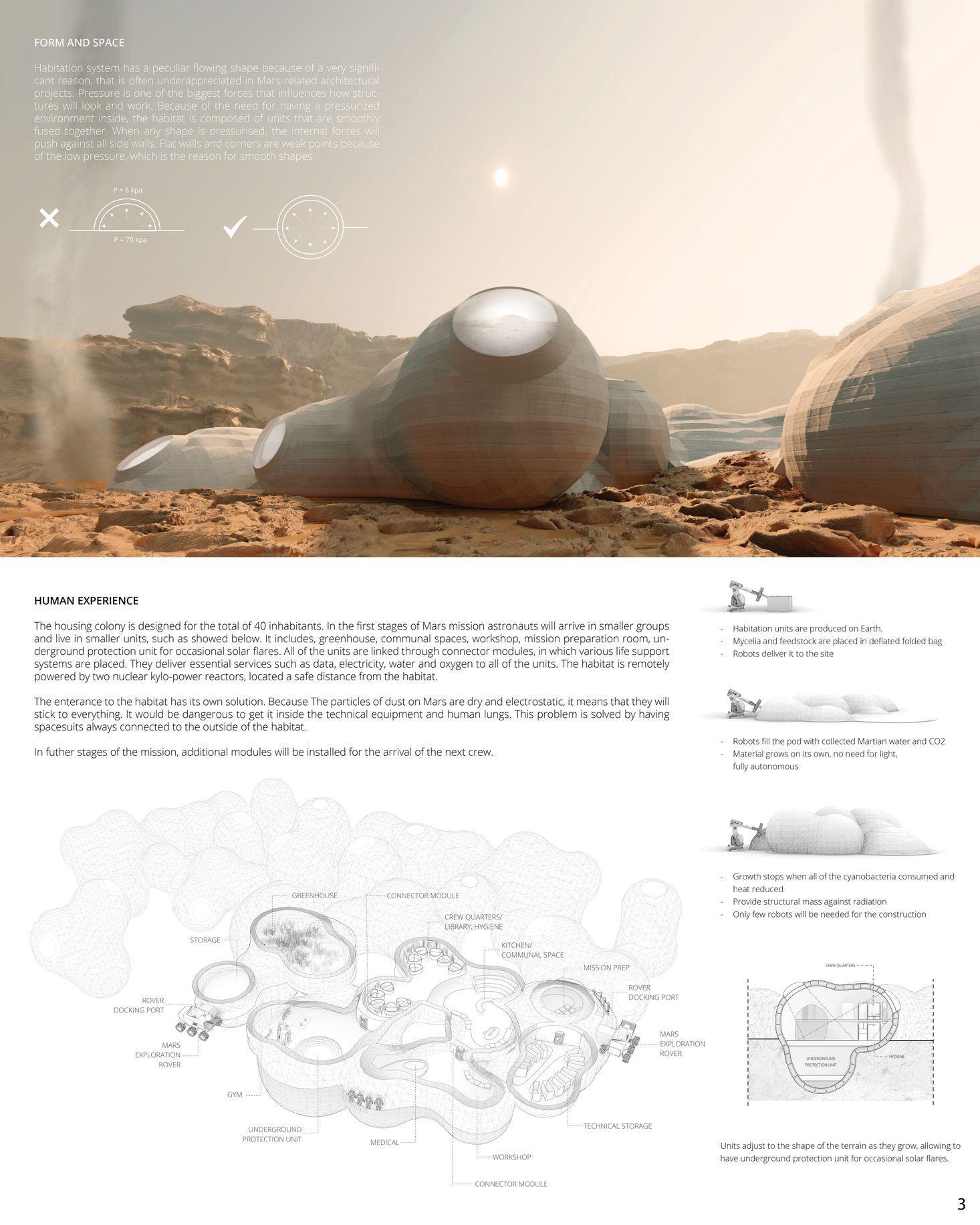 half-buried structure, but a bright, multi-level, corridor-free home that stands upright on the surface of Mars. Where structures on Earth are designed primarily for gravity and wind, Martian conditions require a structure optimized to handle internal atmospheric pressure and thermal stresses. Marsha's unique vertically oriented, egg-like shape maintains a small footprint, minimizing mechanical stresses at the base and top which increase with diameter. Standing tall on the surface grants the human crew a superior vantage point to observe a dynamic landscape with weather patterns, clouds, and shifting hues – their new home and object of study. The tall, narrow structure reduces the need for a construction machine to continuously rove on the surface, reducing risk and increasing speed and accuracy.