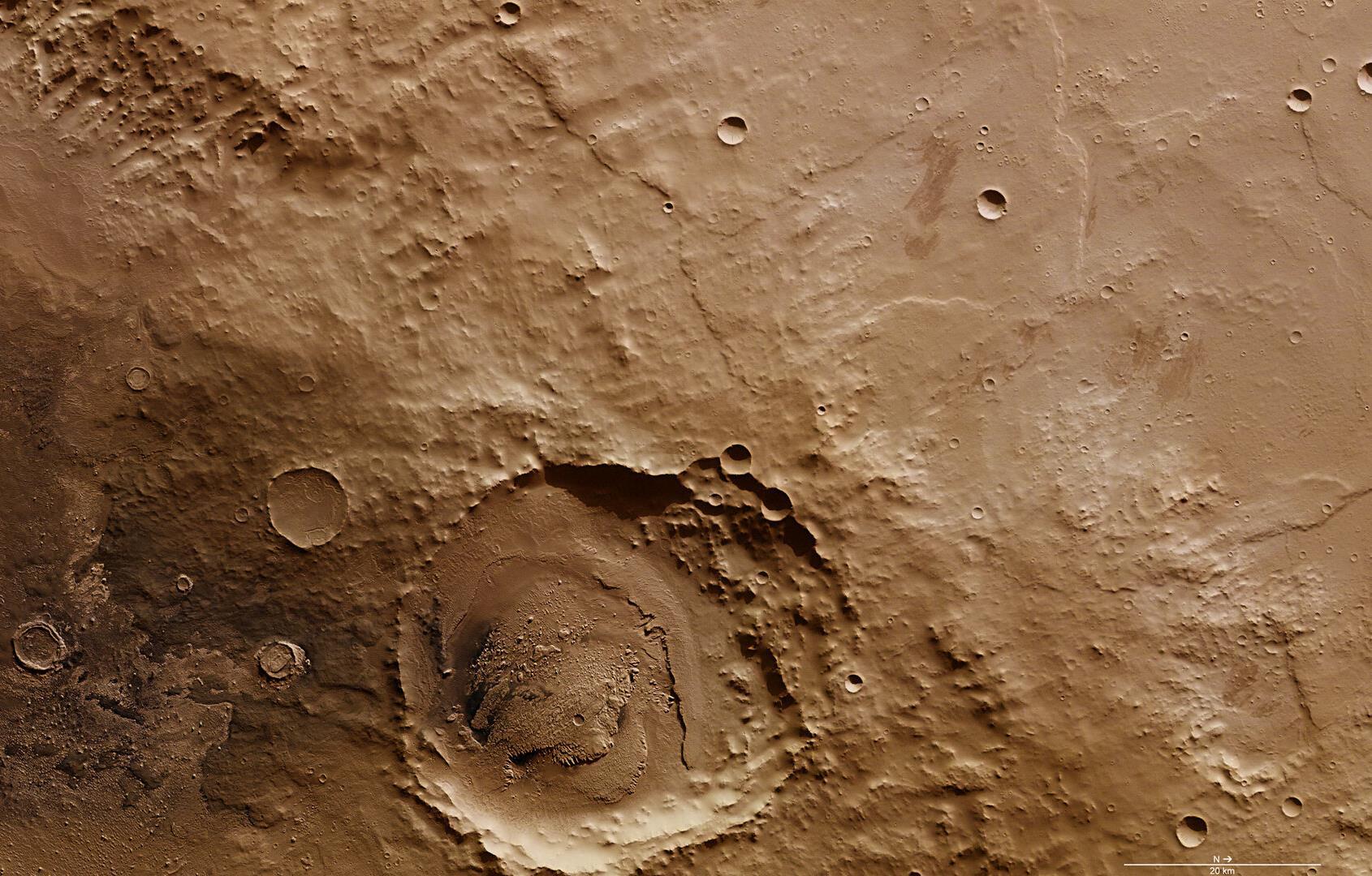 Violent impacts and fluid flows blasted and carved Holden Crater. Scientists have flagged the old impact crater as a place that could have had habitable conditions for microbial life. Minerals here formed in a body of water the size of Lake Huron. Water flowing out of the broken crater rim swept away layers of sediment and revealed even older clay sediments from another, earlier lakebed. That older lake could have existed for thousands of years, long enough for microbial life to take hold. The clays have the potential to preserve signs of life.