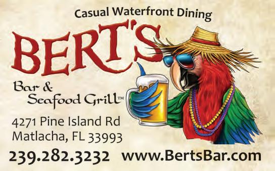 BERT'S BAR & SEAFOOD GRILL : 4271 Pine Island Rd, Matlacha. 282-3232. DAILYFROM 11AM. Million dollar waterfront view and quality food at reasonable prices. Casual dining on the dock. Featuring grouper, Gulf shrimp and certified angus burgers. Live entertainment. 'All-U-Can-Eat' Fish Fry Wed & Fri 49pm. www.bertsbar.com