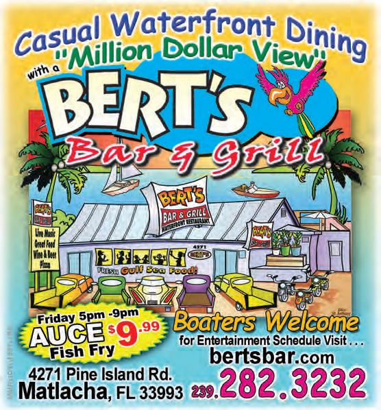 BERT’S BAR & GRILL: 4271 Pine Island Rd, Matlacha.282-3232. Open Daily 11a-11p. Waterfront locationwith outside casual affordable dining on the Dock. Million Dollar View of Matlacha Pass and open water.Seafood, Burgers, Baskets & More. Live music nightly. www.bertsbar.com
