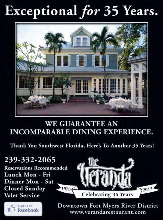 Lunch: Mon-Fri 11a-2p; Mid-Day Menu: Mon-Fri 2-4p; Dinner: MonSat 5:30-10p. In historic downtown Fort Myers, the Veranda takes you to a bygone era of Antebellumcharm. Romantic setting in two turnof-the-century homes, Southern Regional Cuisine, extensivewine list and first class service provide a unique dining experience. Celebrating their 32nd year as one of the most award-winning restaurants in the area. www.verandarestaurant.com
