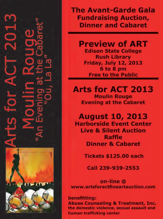 The 2013 Arts for ACT gala & auction fundraiser, being promoted as ‘Moulin Rouge –An Evening at the Cabaret,’ will be held the evening of August 10 at the Harborside Event Center on the riverfront in Fort Myers’ historic River District. In past years the guest auctioneer has been Meryl Streep, Lily Tomlin, and Sharon Stone. This year’s guest auctioneer has yet to be named.