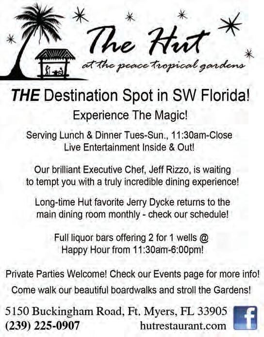 THE HUT at the Peace Tropical Gardens: 5051 Buckingham Rd. 225-0907. Tue-Sun 11:30am – close. The historic Hut has been completely restored from top to bottom. The magnificent gardens date back to Thomas Edison's times in the 1920's. Chef Jeff Rizzo brings his culinary artistry to the place in Southwest Florida for your special event or a night out. The new Hut is breathtaking and a must stop for all that come to Southwest Florida. www.hutrestaurant.com