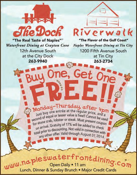 THE DOCK: At Crayton Cove, 12 Ave S, Naples. 263-9940. Open seven days for lunch & dinner, Sunday brunch. Bay views, great food and a laid back attitude. ‘The real taste of Naples’ since 1976. Freshest seafood, salads, steaks and sandwiches with tropical flair. Sunday Brunch and Make Your Own Bloody Mary Bar. www.dockcraytoncove.com