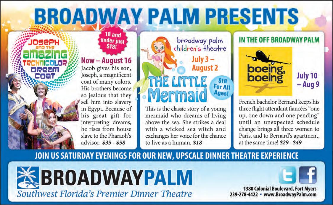 BROADWAY PALM: 1380 Colonial Blvd., Ft. Myers. 278-4422. Wed-Sun 5:30p dinner & 7p show, with selected children’s matinees 11:45a lunch & 1:15p show. Broadway Palm, Southwest Florida's premier Dinner Theatre, is a great destination for those looking for quality entertainment and a delicious buffet at a great price. www.broadwaypalm.com