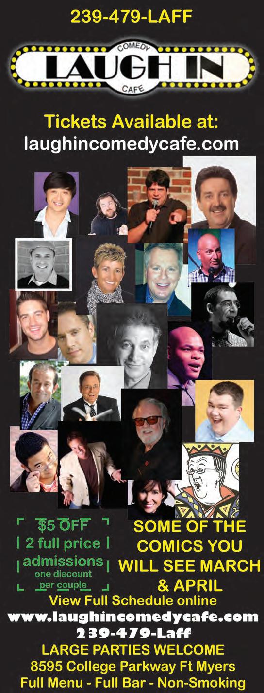 LAUGH IN COMEDYCAFE : 8595 College Pkwy, # 270, Ft Myers. 479-5233. Come to laugh, eat & drink. Along with having hilarious national touring comics every weekend, they have a full kitchen serving delicious fresh meals. Home of The Big Bopper Burger. Pasta fans have a choice of Chicken Parmesan or Pasta Milano with tender chicken & fresh mixed vegetables. New look! All shows are smoke free! Five weekly shows Thu-Sat at 7:30 & 9:30. Plus special events. www.laughincomedycafe.com