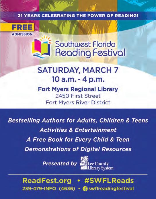 The Lee County Library System is also offering fans a chance to meet and mingle with the SWFL Reading Festival authors during An Evening with the Authors fundraiser, Friday, March 7, 5:308:30pm, at the Marina at Edison Ford, located at 2360 West First St. in downtown Fort Myers. Paid reservations are required for the buffet dinner overlooking the Caloosahatchee River. Proceeds from An Evening with the Authors benefit the Southwest Florida Reading Festival,