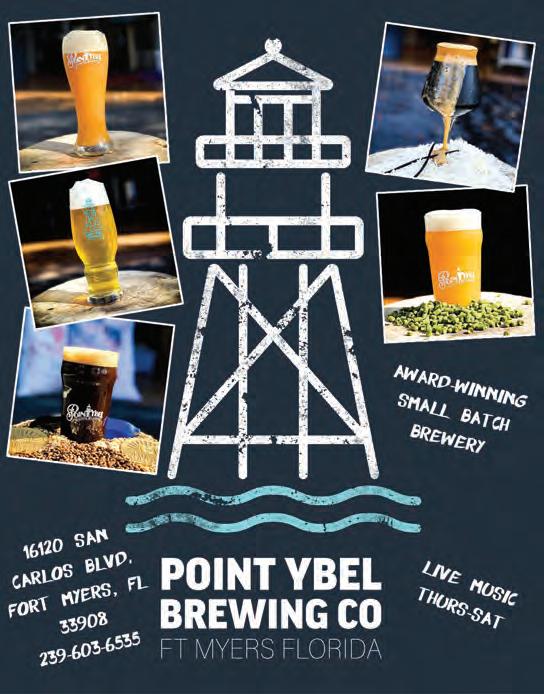 POINT YBEL BREWING COMPANY: 16120 San Carlos Blvd, unit 4, Fort Myers. 603-6535. Point Ybel's awardwinning beer is as much art as it is science. Point Ybel has been known for brewing East Coast Style IPAs, traditional beers brewed to style, and also introducing Sour Ales to Southwest Florida. Rotating beer list of over 20 house made beers and new beer releases weekly. BBQ &Bluegrass first Sat of month, 5-8pm. Mon & Tue 2-7pm, Wed & Thu 2-10pm, Fri 2-11pm, Sat 12-11pm, Sun 12-7pm.