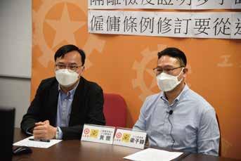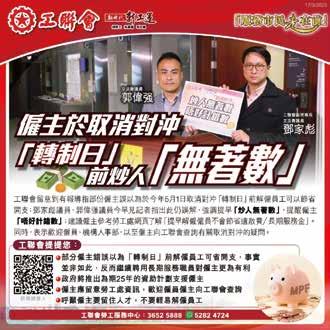 工聯會高度關注和重視海皇粥店員 工權益的問題,郭偉强和梁子穎於5 月8日一同會見傳媒,就海皇粥店全 線結業事件作出回應。工聯會認為 企業未能主動承擔員工權益保障義 務,形同將責任轉嫁政府與勞工自 身,應予以譴責。