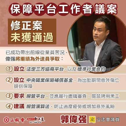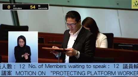 梁子穎發言支持「保障平台 工作者」議案,認為需探究 平台經濟是否存在不公平 性 ,甚至具有剝削性,若是 如此,認為議會應該努力維 護勞動者的權益,不應該只 關顧部分既得利益者。