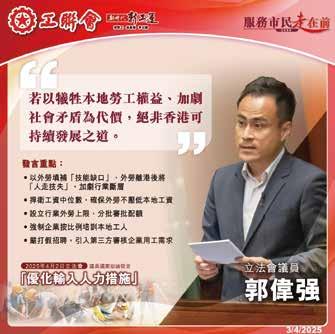 2025年4月1日,郭偉强促請政 府恪守「本地勞工優先就業」的 承諾,為各類輸入勞工計劃設立 行業的上限,尤其對失業情況嚴 重、工資收入受壓的行業和工種 ,要凍結並逐步削減輸入勞工名 額。