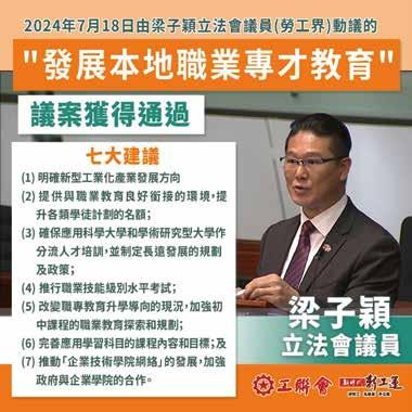 卷調查結果,並提出一系列建議措施,包 括調撥資源推動職專教育發展、提升技術 專才待遇、加強初中生涯規劃、與職工會 攜手推動職專教育、助基層工友變成技術