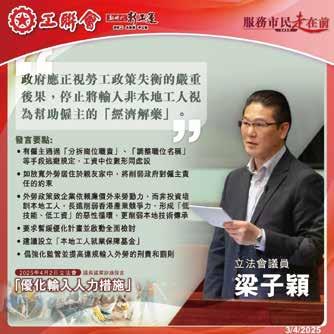 梁子穎於2025年4月3日亦就「優化輸入人力 措施」議員議案進行辯論,強烈要求政府保 障本地僱員就業優先,讓人民參與經濟活動 獲得經濟收獲同步參與本地消費,才是謀發 展、拼經濟、搞建設、惠民生的正確工作方 向,更是正確的「經濟解藥」。