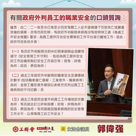 郭偉强在2025年4月2日的 口頭質詢中提出,自2021 年至今已有至少4宗有關工 人從木摺梯墮下引致死亡或 嚴重受傷的個案,因此需要 關注政府外判員工的職業安 全。