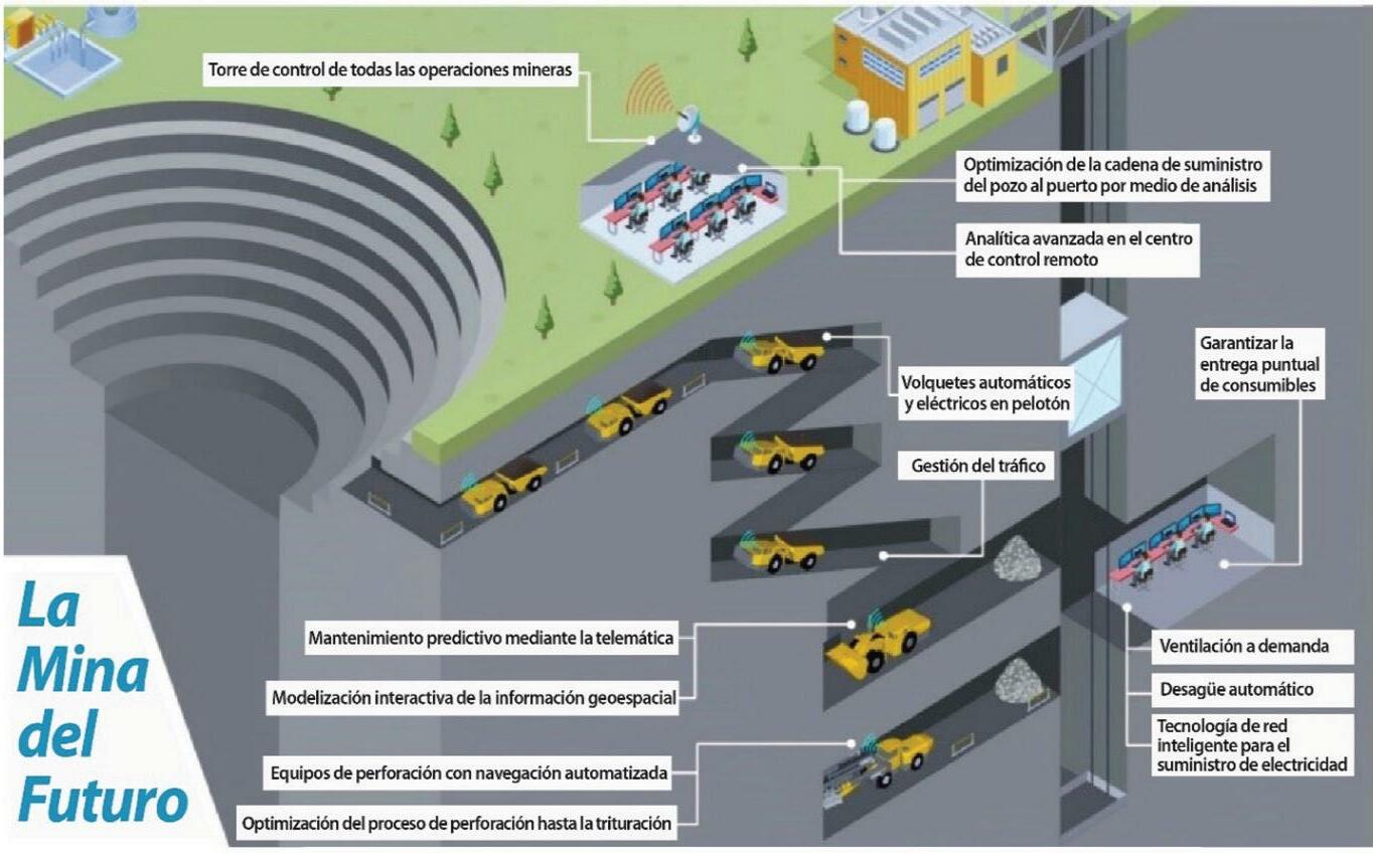 En las minas del futuro se utilizarán todo un conjunto de tecnologías que permitirán alcanzar los objetivos de productividad, seguridad y economía. Algunas de estas tecnologías innovadoras son las siguientes: redes eléctricas inteligentes, ventilación bajo demanda, desagüe automatizado, mantenimiento predictivo, modelización integrada de información geoespacial, gestión del tráfico, etc.