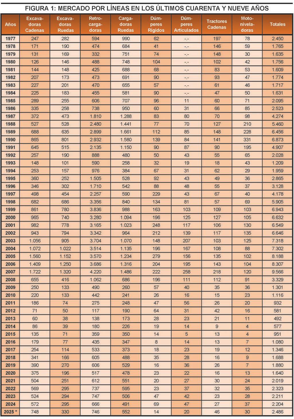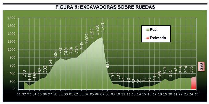 de los años. En 2020, como consecuencia del Covid, sufre una importante caída del -53,1%, un crecimiento del 28,06% en 2021, un 17,52% en 2022, una ligera caída de un -0,3% en 2023, un exiguo incremento del 0,3% en 2024, y un repunte del 11,86% en este último año, si se consolidan las previsiones en 2025. A lo largo de los años, se tiene que el mercado de las excavadoras de ruedas oscila entre las 1.320 del año 2007, máximo absoluto de los cuarenta y nueve años de los que se dispone de datos, y las 38 unidades del año 2013, mínimo histórico también desde que se tienen datos de ventas.