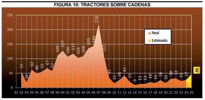 En la Figura 10: Tractores sobre cadenas, se puede ver hasta siete mínimos, de 18, 49, 57, 106, 103, 15 y 9 unidades, correspondientes a los años 1993, 1995, 1998, 2001, 2003, 2010 y 2014, confirmando el del ejercicio 2014, con 9 unidades, como el más bajo de la historia. Máximos son ocho de 62, 67, 127, 117, 218, 42, 32 y 46 unidades, correspondientes a los años 1994, 1997, 2000, 2002, 2007, 2012, 2022 y el estimado 2025. El máximo absoluto de esta línea corresponde a las 218 unidades del año 2007 considerando el periodo de 49 años entre 1977 y el presente 2024, un poco por encima de las 197 unidades del año 1977 y bastante por encima de las 148 del año 1989. El