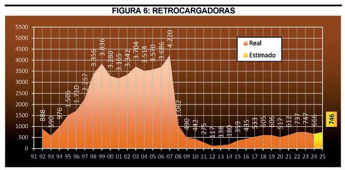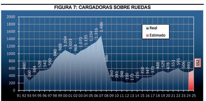 Para las cargadoras de ruedas la previsión teórica para 2025 es de 552 unidades, habiéndose vendido 491 en 2024, 506 en 2023, 595 en 2022, 551 en 2021 y 478 en 2020. En el presente ejercicio las cargadoras de ruedas alcanzan un peso relativo del 22,2%, del 22,37% en 2024, del 22,88% en 2023 frente al 25,61% del 2022, del 27,2% el 2021 y del 29,1% en 2020.