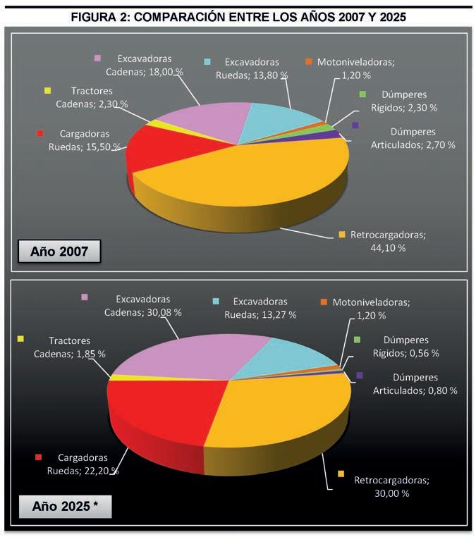 En lo que se refiere al peso relativo de las excavadoras de cadenas con respecto a las ocho líneas, se tiene que en 1992 era del 12,7%, un 22,86% en 2020, un 24,96% en 2021, un 24,49% en 2022, un 23,69% en 2023, un 25,95% en 2024 y un estimado del 30,08% en 2025. Es significativo que en 1977 el peso relativo era del 10% y en 1990 del 12,6%, periodo en el que se fue consumando la sustitución del binomio cargadora/dúmper por excavadora de cadenas/dúmper.