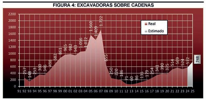En la Figura 4: Excavadoras sobre cadenas, se aprecian los cinco mínimos de 148, 346, 943, 1.409 y 60 unidades correspondientes a los años 1993, 1996, 2002, 2006 y 2013. Los máximos son también cuatro, con 982, 1.560, 1.722 y 748, correspondientes a los años 2001, 2005, 2007 y 2025, si se consolidan los datos de este último año. El máximo del año 1990, hasta entonces récord, de 865 unidades, es superado ya desde el año 2000 hasta el máximo absoluto de 2007 con 1.722 unidades.