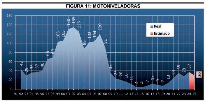 las motoniveladoras son máquinas especiales, no propias de producción, sino de nivelación y mantenimiento de pistas, y su mercado es muy variable. Parten de las 78 unidades del año 1977, alcanzan su máximo de 331 en el año 1990, y caen a sólo 4 en el año 2014 y la misma cantidad en 2015, se incrementan hasta el 2017, llegando a las 12 unidades, continúa una caída hasta el año 2019, alcanzando las 7 máquinas vendidas, vuelve a repuntar hasta las 35 unidades del 2022, cae hasta las 28 unidades en 2023, sube hasta las 37 en 2024 y desciende hasta las 30 unidades en 2025, si se confirman las estimaciones.