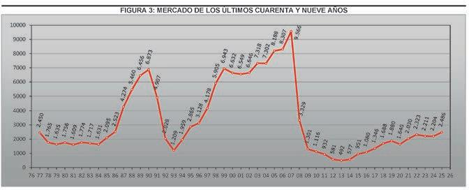 La Figura 3: Mercado de los últimos 49 años, elaborada a partir de los datos de la Figura 1, muestra la evolución del mercado anual del conjunto de las ocho líneas a lo largo de estos 49 años, que van desde 1977 hasta el actual estimado 2025, en el que se aprecia todo lo que se venía comentando con respecto a las tres crisis y la pandemia del 2020, y los máximos y mínimos de mercado en estos 49 años.