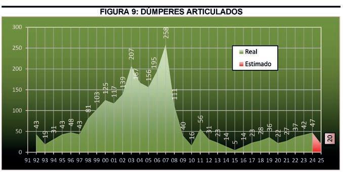 ra 9: dúmperes articulados). A partir de este último ejercicio, las ventas han ido cayendo, excepto en el 2011, que hubo un incremento importante, llegando a mínimos de 5 equipos en el 2015. En 2019 llegaron a otro máximo con 36 unidades y 2024 a las 47 máquinas. Si se cumplen las previsiones en 2025, el mercado caerá hasta las 20 unidades. Su peso relativo ha variado mucho, aunque siempre ha estado en torno al 0-2,5%.