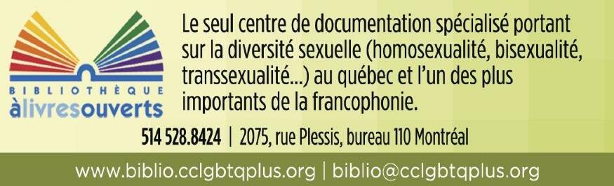 Toute reproduction, adaptation ou traduction est interdite sans l’autorisation de l’éditeur Les articles publiés n’engagent que leurs auteurs et ne sont pas nécessairement les opinions du magazine Fugues n’est pas responsable des manuscrits, visuels, dossiers électroniques et photos qui lui sont soumis Le matériel non sollicité envoyé demeure la propriété de Fugues La parution du nom ou de la pho tographie d’un individu dans cette publication n’implique nullement une définition de son orientation sexuelle ou de son identité de genre L’exactitude de toute information fournie dans les annonces relèvent de la responsabilité des annonceurs L’éditeur se réserve le droit de publier ou non tout maté riel fourni par les annonceurs et/ou auteurs L a ve rs i o n i m p r i m é e et l e s ve rs i o n s numériques de FUGUeS rejoignent plus de 3 3 0 0 0 0 p e rs o n n e s c h a q u e m o i s ( 1 67 0 0 0 lecteurs pour la version imprimée et plus de 160 000, pour la version numérique) Doré navant, le tirage imprimé de Fugues variera
