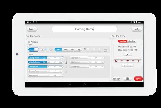 Create up to 12 custom scenes to run a series of commands at the touch of a button or at a chosen time. Commands can include turning the unit on and off, changing the mode or temperature, and selecting which zones are open. Scenarios such as going to work, coming home or bedtime can be easily programmed to control the air flow and temperature to rooms required at set times.