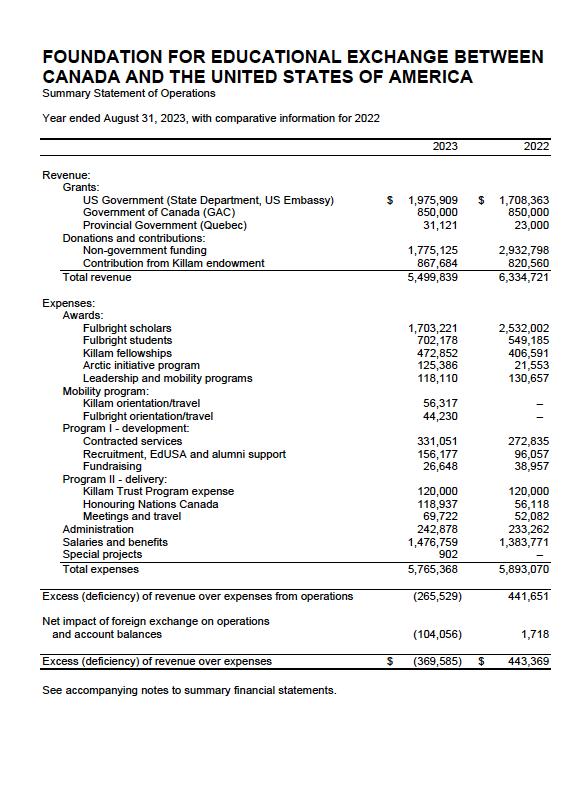 The accompanying summary financial statements of the Foundation for Educational Exchange Between Canada and the United States of America (the Organization), which comprise the summary statement of financial position as at August 31, 2023, the summary statement of operations for the year then ended, and related notes, are derived from the audited financial statements prepared in accordance with Canadian accounting standards for not-for-profit organizations, of the Organization as at and for the year ended August 31, 2023.